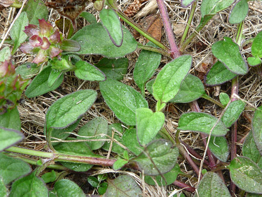 Flowers of prunella vulgaris consist of a hooded upper lip above a larger, three-lobed lower lip, the middle section of which is delicately fringed. The reddish-brown calyx, below the petals, is also lobed, and bristly. Flowers form an elongated cluster (2 inches tall) but only a small number bloom at any one time, so the most visible components are the calyxes. The tough stems are square in cross-section and also bear long, stalked leaves. The common name self-heal refers to the ability of the plant to heal wounds; the leaves have also found use in tea-making, and as a salad ingredient.