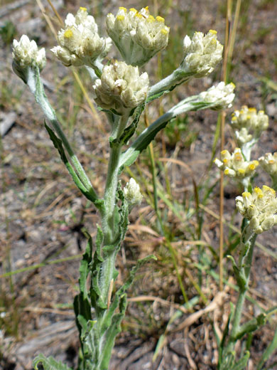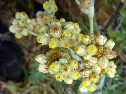 The main identifying features of pseudognaphalium stramineum are the grey-green color of the leaves (the same on both sides), the clasping leaf bases, the dense flower clusters and the yellow color of the disc florets. Plants are most commonly found in coastal areas of the three Pacific states, but also occur inland, up to 8,000 feet elevation. Leaves and stems are densely covered by soft, white, non-glandular tomentose hairs. Leaves are generally flat, though the edges may be curled slightly downwards.