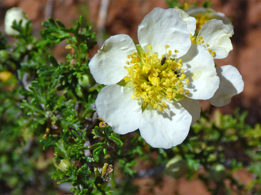 Purshia stansburiana, a densely branched shrub, inhabits desert or semi-desert environments in the Southwestern states. Flowers are about one inch in diameter, have five rounded white petals, five smaller, pointed green sepals and a bushy cluster of numerous yellow stamens topped by yellow anthers; they grow profusely along the upper ends of the woody branches, which are covered in greyish-brown bark. On thicker branches the outer layer of the bark is thin and peeling. Leaves are divided into thin lobes, which are bright green in color, shiny and somewhat sticky (glandular); they have three lobes at the tip, and another two at the side.