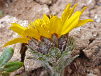 Flowerheads are usually solitary; they have a bell-shaped involucre linked by relatively broad phyllaries, of different lengths, in several rows, colored green to purple. Phyllaries, and stems, have a covering of shaggy white hairs. Flowerheads contain over 100 disc florets ringed by 20 to 55 yellow ray florets.