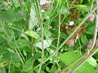 Raphanus sativus, originally from Europe, has been established in small areas of all the US states, and is most widespread along the Pacific coast. Flowers are large and numerous, occurring in a range of colors - white, pink, purple, yellow, crossed by darker veins which form a neat, symmetric pattern. Some shades result from hybridization with the similar raphanus raphanistrum. The four petals are up to one inch in length, while the elongated, reddish green sepals measure around half an inch. The flower center contains six yellow-topped stamens, two a little shorter than the others.