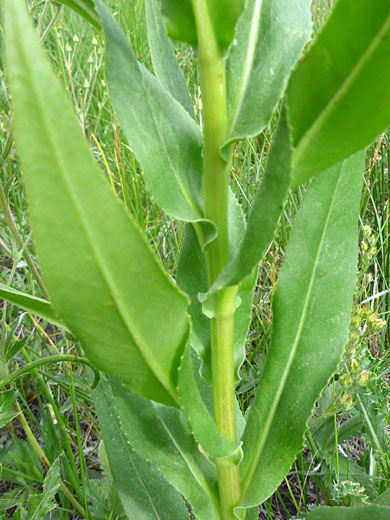 The plant forms small clusters, typically with a dozen heads. The large green leaves grow at the base and most of the way up the stem in an alternate arrangement; they are hairless or only sparsely hairy (tomentose). Mid to upper stem leaves are clasping.