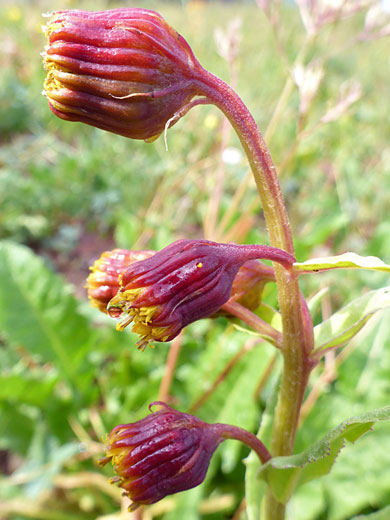 senecio bigelovii, which features flowers that are nodding - pointing directly downwards - and contain disc florets only, no rays. Only a very few other senecios produce nodding heads, and those that do also have ray florets, for example