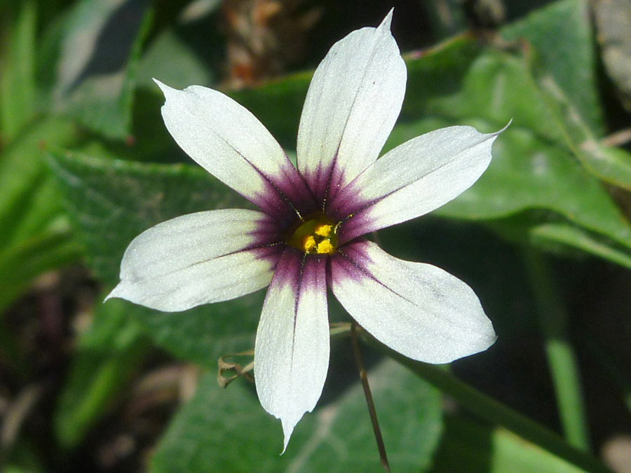 White, purple-centered flower of sisyrinchium bellum, in Patricks Point State Park, California