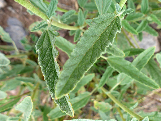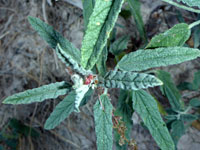 This species is one of the tallest in the genus, with upright stems reaching heights of eight feet or more. Leaves are long and narrow, quite thick, and usually unlobed, though sometimes with a pair of triangular lobes at the base. Leaves have a prominent midvein, and (usually) one or two pairs of angled side veins. Stems and leaves have an even, sparse covering of star-shaped hairs