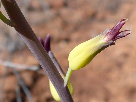 The unusual flowers of streptanthus cordatus consist of an urn-shaped calyx, greenish and wider lower down, purple and narrower at the top, and four narrow purple petals about half an inch long, somewhat folded along the axis. Inside are several pairs of short stamens and a two-lobed stigma. Buds are light green to yellow. Flowers are produced at alternate, quite widely-spaced intervals along the top few inches of the smooth, hairless, mostly leafless stem, which can reach heights of 3 feet or more. Stems are usually unbranched, and have a somewhat waxy texture. Basal leaves are attached by stalks, and have a few edge teeth, mostly towards the tip, while lower stem leaves are clasping, with smooth edges. The teeth are often bristly.