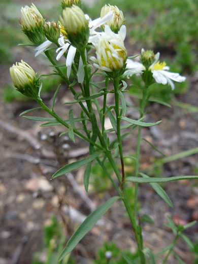 The common name of symphyotrichum porteri, smooth white aster, refers to the stems and leaves, which are smooth and hairless, and the flowers which are white. Leaves are relatively long, up to 3 inches, but thin, a quarter of an inch or less; they have one or more central veins, a spike at the tip, and edges that are usually entire, but may have tiny teeth towards the end. They grow all the way up the stem, becoming shorter and more linear, often with smaller leaves, or wings, at the base.