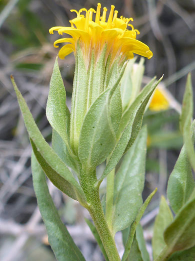 Trixis californica is one of two members of this genus found in the US; the other occurs only in far south Texas. The common name threefold refers to the lower lip of the two-lipped, bilaterally symmetric corolla, which is divided into three lobes, spreading outwards, away from the center of the flowerhead. The upper lip is narrower, divided into two lobes, and usually rolled up. The flowerhead contains between 11 and 25 individual flowers (usually around 15), bright yellow in color. The anthers and style protrude well beyond the corolla when mature. The involucre is lined by 8 to 18 slender green phyllaries, about half an inch long, with pointed tips. The flowerhead is subtended by 5 to 7 leaf-like bracts.