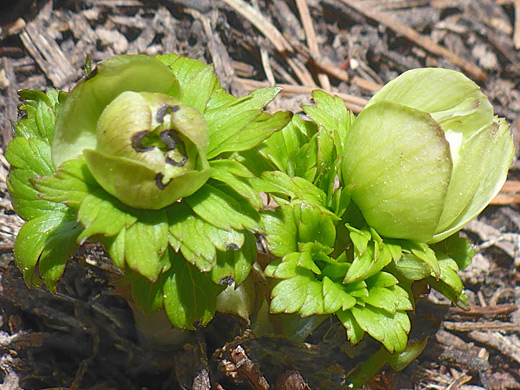 Trollius albiflorus has between one and three stem leaves, alternately arranged, clasping or short-stalked, plus a few at the base, attached by slender stalks of up to 10 inches. Leaves are hairless, partially divided into three or five lobes, each further divided, or toothed. Stems are thick, grooved, and hairless.