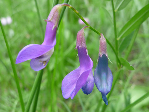 Plants produce several flower clusters, each typically containing between 2 and 9 heads, all of which generally point in the same direction. Flowers are colored pink to bluish purple, and like most pea-like species, have a wide, backwards curving banner petal above the four smaller inner petals. They are a little less than one inch in length. The hairless calyces are green or reddish, extending to five short lobes, of which three are a little longer than the other two.