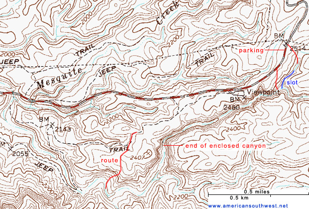 A suitable parking place is along the Apache Trail 3.1 miles east of Tortilla Flat, beside an electricity pylon and concrete building - near the end of the paved part of the trail, just south of some powerlines. This section of the route runs along a narrow ridge, with canyons on both sides; the slot is to the south, out-of-sight of the road.