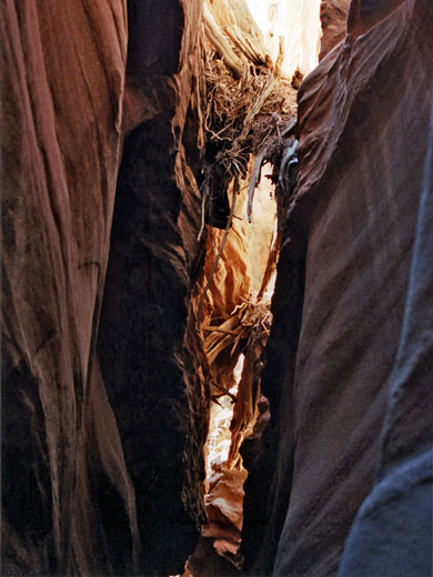 The slot starts where the surrounding land changes from predominantly sandy dunes to all rock. A dryfall leads to some short narrows that can be explored easily only as far as a tight drop, difficult to pass but avoidable if the canyon is explored from below - it can be re-entered after walking along the west rim for about 10 minutes. Below this drop is a moderately deep stretch of pretty, curving slot canyon, quite dark in places as the rocks overhang above, and often with some shallow pools. The walls have similar wavy bands as are found in the domes and cliff faces above the canyon. All can be seen in about 15 minutes but this part of the west fork is very photogenic and has a variety of different rock forms in its short length.
