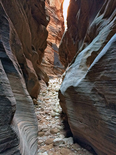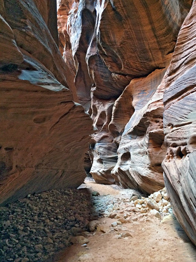 The water is permanently cold and muddy, and the canyon is certainly not a place to take expensive footwear. The walking surface is roughly half sand - sometimes hard and damp but mostly soft and dry - and half stones or boulders, so progress is more difficult than might be expected as the terrain is largely flat. There are some places where the floor drops a few feet but none of the sheer dryfalls found in some other slot canyons.