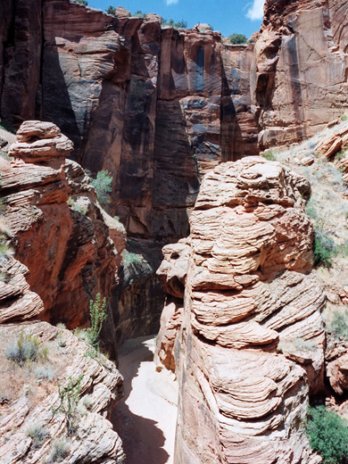 More boulders for a while, then another nice narrow section with colorful walls that rise up to 400 feet above the floor. |