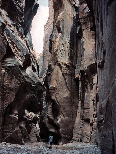 The canyon became quite dark, narrow and cave-like, with many more cold pools. Alternating warm and cool winds blew as the passage turned right and left, with only occasional glimpses of the sun. |
