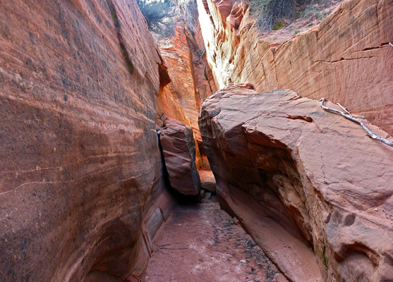 Coral Pink Sand Dunes State Park. The hiking route is along the track perpendicular to the highway, around a small knoll then cross-country down the steep, sandy slope on the far side, joining the drainage just below the lower end of the slot, where the wash emerges from vertical red cliffs, about 50 feet high, exactly like the lower ends of the two branches of Sand Wash. Upstream, the canyon has a few pretty chambers through stripy rocks, then a dryfall that might be difficult to climb, followed by shallower narrows, another dryfall, a straight passage and more potholes and falls, above which the wash becomes shallow and sandy-floored. All obstacles can be bypassed if necessary, by climbing around on the north side. The rocks in the narrows are deep red in color, covered in a few places by bright green moss; also similar to Sand Wash. Many footprints in the narrows, and a rope at one bypass point, suggest the canyon is quite well known, and while not so spectacular, it is worthwhile owing to its easy approach.