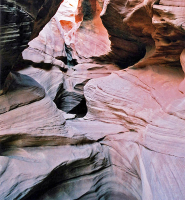 The first (north) fork is as good a place as any to start, and there are plenty of fine parking/camping places on the level slickrock plateau beside the canyon, which south of the track soon becomes a few meters deep with a flat floor bordered by typical Cedar Mesa sandstone strata at either side. Some shallow narrows and a few small dryfalls are followed, after 15 minutes walking, by a deeper, 2-stage drop. First is a short, twisting slot that empties into a reddish, bowl-shaped chamber eroded into many thin strata, and containing a large pool in times of rain. Just beyond, a deep, narrow crack also leads into a pothole, flooded to depths of 15 feet after rainfall but easily passed if dry. Both obstructions could be avoided by climbing around and re-entering the canyon below where, after another short stretch of narrow channels, the ravine opens out a bit and meets the south (main) fork. Upstream along here is a longer slot, though still rather shallow, that has especially crisp passages carved through pinkish grey rocks containing many thin, wavy strata, ending beneath a fall of 10 feet towards the far end, where the main canyon becomes noticeably less deep.