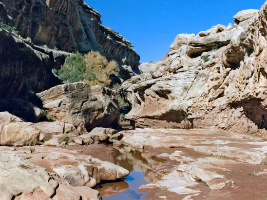 Some parts of this section have standing water most of the year, in places several feet deep and quite lengthy; swimming may be needed on occasions. The narrows end at a little curvy pour off above which the canyon is wide again, a pattern which repeats for the next 13 miles or so upstream; long open parts then short slot sections with pools and dryfalls. Often benches form at either side of the canyon and may allow the dryfalls to be easily bypassed, as well as providing an alternative to walking in the streambed, which may be wet or muddy.
