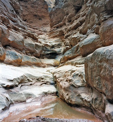 The Jackass Creek canyon continues via a pretty section of smooth channels and shallow pools, enclosed by whitish multi-layered rocks. For the remainder of the way to the river, the canyon is filled with many fallen boulders and huge sandstone blocks of varying colors and forms - the Coconino sandstone walls above seem particularly unstable and crumbling. The creek deepens quickly, and much scrambling is necessary, over or under rocks and around the edge of muddy pools. Often possible routes have been marked with arrows by the Navajo as the best way ahead is not always obvious.