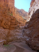 After 40 minutes walking, a small side canyon merges from one side and the main south fork joins from the other, as the gorge deepens more abruptly, containing larger fallen boulders that sometimes block the streamway. A short distance further is a short narrow section preceded by a 30 foot drop with a pool below. Climbing down unaided is just possible, but usually there will be several ropes, left by the Navajo who regularly travel this route to fish in the Colorado River.