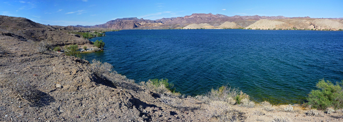 Highway 165 is 18 miles long, initially quite busy, as far as the town of Nelson and the nearby El Dorado Mine, a popular tourist destination. The latter section is less traveled, since there are no facilities or trails by the lake. The road reaches a highpoint of 1,065 feet then descends steadily, following the shallow canyon of Techatticup Wash. The last few miles pass gravelly washes and barren ridges, densely covered by