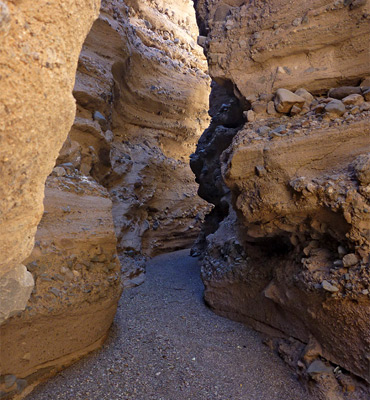 The rocks are conglomerate, a mix of sand and pebbles typical of desert areas, generally colored light brown to yellow, and quite pretty when illuminated by reflected sunlight. The passageways contain a few chutes and dryfalls but no major obstacles, and the floors are generally flat gravel.
