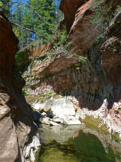 From the car park, the path crosses a meadow, runs alongside Oak Creek briefly, through a corridor of trees then passes over the stream on a high bridge, into another meadow, site of the ruins of Mayhew Lodge, which operated as guest accommodation until 1968. The official West Fork Trail begins just beyond, entering the canyon and following the creek for nearly 3 miles before descending to the pebble beach in front of a long pool, framed by eroded, subway-like cliffs. A notice warns backpackers that camping is not permissible until after another 2.7 miles. The pool is relatively shallow, usually just one foot or so, and extends for 400 feet, round a wide bend, then gives way to a sequence of smaller pools and boulders, at one point overlooked by a huge, streaked, overhanging, head-shaped rock formation. The streamway then becomes bushier, and less enclosed, as it curves through a U-shaped bend and heads north towards the next pretty section, another subway-like like passage below vertical, blackish walls, with a lengthy pool beneath. Not far beyond is a tributary on the south, originating on the slopes beneath Buckhead Point. The lower end is overgrown, usually dry, and does not look particularly interesting. Past the confluence is another wading pool and a bushy section; a long, straight, now heading northwest, about one mile from the end of the trail.