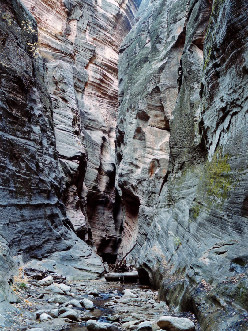Dark, narrow passageway, near the lower end of the canyon