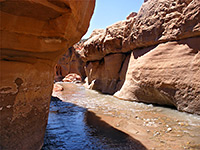 Another branch joins from the right and the canyon deepens a little as the bendy, medium width narrows continue for another mile or so, opening out when the Navajo is replaced by thin-bedded strata of the Kayenta sandstone layer. This part has a permanent stream for a while, flowing through some pretty pools, over fluted terraces and past other eroded formations, and lasts for another 30 minutes until the creek starts to cut into the deep red rocks of the cliff forming Wingate sandstone. There is no immediate change in narrowness but the canyon walls are now more generally vertical, the canyon deepens and remains quite winding, later becoming more like a slot canyon although the only true slot section is just before the end, where the channel drops into a 200 yard section with typical water-carved curving walls, several chokestones and pools, which may require some wading after wet weather.