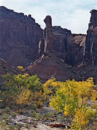 Around the next bend, the Wingate ends and so do the narrows. The canyon is now 500 feet deep and remains so, widening gradually, for the next 3.5 miles to the high water mark of Lake Powell, passing cottonwood trees, large boulders and bushes - quite flat apart from occasional steps downwards over ledges of the Chinle Formation, though loose pebbles and patches of clayish mud make walking sometimes a little difficult. Near the lake is the distinctive Hoskinnini Monument, a tall, slender pinnacle rising to a head shaped top, like an Egyptian sculpture. Past this the stream begins to flow once more, and at one point drops over a 3 meter high shelf forming a small, pretty waterfall, then enters an entrenched channel with grassy sandbanks and clumps of reeds at either side which soon meets the larger streambed of Trachyte Creek, along which the waters flow rather more forcefully.