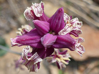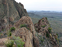 After leaving the track to Oak Spring, the trail ascends slightly then turns east, over open, undulating land; a shallow basin followed by a gentle incline, coming close to the base of the vertical pour-off below the Window. A hiker-made path heads south, back down into the rocky creekbed, which can be followed upstream all the way to the base of the cliffs. The official trail bends back north and starts a short series of switchbacks, climbing to a saddle at the base of a isolated, jagged pinnacle, which looks quite dramatic when viewed in front of the desert plains to the west. Vegetation hereabouts includes hedgehog cactus, prickly pear cactus and sotol.