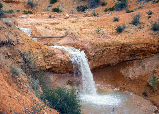 The right branch of the Mossy Cave Trail leads a little further upstream to the waterfall, where the stream tumbles 15 feet over a ledge into a circular pool; above is a swirling channel and several quite deep potholes, formed by the water eroding into the soft, orange-colored limestone. Further erosion is slowed by an underlying layer of much harder dolomite. Apart from small hoodoos and other minor formations lining the cliffs above the stream, the surroundings are wooded and gently undulating - not as scenic as the more famous section of the national park to the south, though walking off-trail further up Water Canyon might be quite interesting. If not then half an hour is enough to see both Mossy Cave and the waterfall.