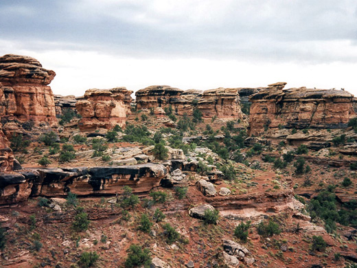 The canyon stays quite shallow for several miles, until the point where it passes the far end of the Needles park road and is crossed by the trail to the