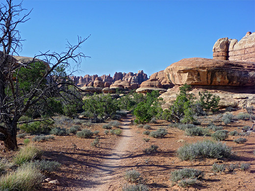 The well worn path climbs above the parking lot, over several benches that make good vantage points for looking at jeeps climbing Elephant Hill Road opposite, and then levels out, crossing a mix of sand and slickrock parallel to a line of tall, thin fins to the west; the east side is open, and the views extend across to the distant red cliffs lining the Needles entrance road. The trail passes through several gaps in lines of lesser pinnacles and reaches a junction after 1.5 miles, with a route from Salt Flat (3.5 miles). The second junction is 0.6 miles further, after descending a narrow, shady, sloping cleft through a line of cliffs (like a smaller version of the Joint Trail further south), down to the sandy floor of Elephant Canyon. A path forks west, up the far side of the canyon towards Chesler Park, while the Druid Arch route continues south, mostly right along the stream bed, for 0.8 miles to a third junction, signed Salt Flat 5.9 miles.