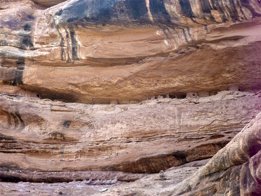The trail leads northwestwards, through bushes and trees and over slickrock bordering the southern canyon rim to the head of a short, steep gully, which provides a quick route to the canyon floor, already 200 feet below the plateau. The next mile or so is directly along the streambed, descending steadily through jumbles of big boulders and groups of trees, and down a few pour-overs. The path is marked by cairns in places and is easy enough to locate but rather tiring to follow, especially when returning. A large tributary joins from the north, as the cliffs on both sides become very high and sheer. Just before the second and last major tributary, also on the north side, is a line of about 25 Anasazi granaries, well preserved but high up and difficult to reach, as are the next set of ruins - several rooms on another high ledge, shortly before the junction with Grand Gulch. One room retains some of the original roof timbers. At the confluence, the gulch is fairly wide, bushy and steep-walled, and contains its own permanent stream, mostly flowing along little channels eroded through the sediment that covers the canyon floor. The round-trip to this place takes from two and half hours.