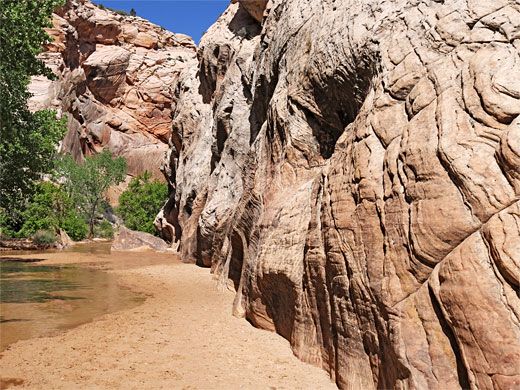 The lower section of a long drainage, a tributary of Cottonwood Creek; forms a deep and narrow gorge through light-colored Navajo sandstone. Usually contains a shallow stream, flowing through pools and cascades, shaded by cottonwood trees; beautiful riparian canyon scenery