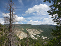 Blue Spruce Campground. More climbing takes the road rounded the divide separating the Pine Creek drainage from the next big canyon, Death Hollow, which is much deeper, though still accessible to hiking, from a signed trailhead near its upper end. The are several dramatic vistas of cliffs and pinnacles before the road crosses a cattle grid in the middle of a narrow neck of land, and turns south, running along the Hell's Backbone ridge. Just before the cattegrid a short track branches northwards to the 1.7 mile