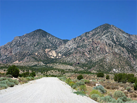 Bull Creek Pass Backcountry Byway, the main route into the high country. To the west this climbs towards Mount Pennell then veers north, past The Horn (a narrow, steep-sided volcanic peak), and across the southwestern slopes of Mount Ellen before rising again and crossing the summit ridge at the eponymous pass (10,485 feet), followed by a long descent to Hwy 95. Just before the highway junction are the red hoodoos of