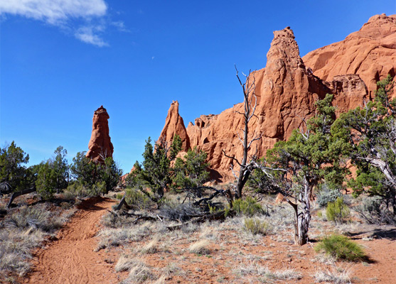 identically named region of Bryce Canyon. The last part of the loop runs due south past another slender pinnacle (Ballerina Spire), and along the side of a red ridge. One additional feature hereabouts is