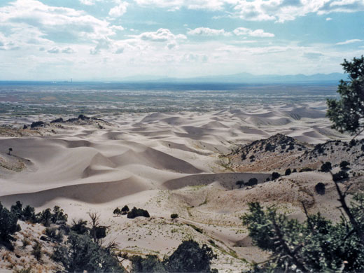 Sand Mountain - an elongated ridge, highest point of which is almost 700 feet above the dunes with steep, smooth slopes of sand devoid of any plants; these represent the biggest challenge for the ORV crowd. The mountain can also be climbed on foot. This is difficult but rather fun, especially when sliding back down - the ascent takes half an hour but only a few minutes are needed to return. Some parts of the hillside have outcrops of weathered, bluish grey sandstone which help when scrambling up, and the ridge on top is formed by the same rock. From here there are great views over vast areas of undulating sand, stretching away to the southwest, a view only slightly spoiled by a power station a few miles away. The top is usually very windy with much airborne sand blown by the prevailing southerly winds - not a good place for expensive camera equipment.
