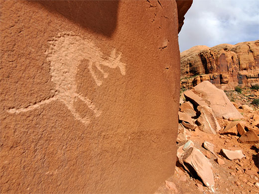 Between Moonflower Canyon and Kane Springs Creek, where the road leaves the river, are several other petroglyph sites, some beside the road at the foot of the cliffs, others a little further east; above the roadside cliffs is a sandy bench, and then taller cliffs, split by many short, vertical-walled ravines, also with some rock art. One site is 1600 feet south of Moonflower, at a small, raised area perhaps with a caravan, and just behind a telegraph pole - a large, fallen boulder covered with dozens of petroglyphs, many rather faint, mixed with signatures and modern graffiti, while above, on the adjacent cliff, are more, better designs, generally clean and crisp. 3000 feet south is a small panel with two bighorn sheep, and then, 1800 feet further, a larger grouping, also at the base of a cliff. These latter two panels are just a few feet from the road. The main access to the bench above the lower cliffs is via a track that climbs to a parking place at the mouth of a little valley then continues, now rougher, northwards, giving access to several small petroglyph panels, none particularly exciting - seen on a walk of around 0.4 miles.