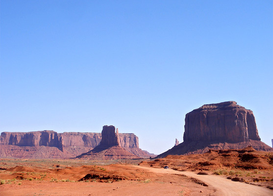 The initial descent from the visitor center includes the roughest section of the whole road, where it traverses a steep, rocky hillside via a series of switchbacks, but this difficult part is quite short and the road soon levels out, then passes by three of the most famous Monument Valley formations, all on the east side -