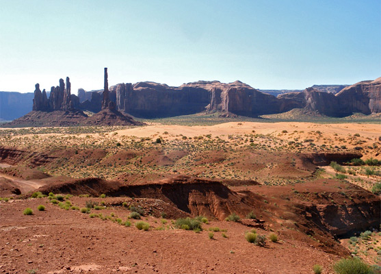 Three Sisters are a group of thin pinnacles, eroded remnants of a narrow ridge extending southwards from one corner of Mitchell Mesa - together with adjoining Wetherill Mesa these two flat-topped hills shield this part of Monument Valley from US 163 further west. There are several similar groups of spires elsewhere in the valley including