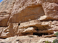Past the first site, the stream flows past an abandoned meander on the south side, soon followed, at the next major bend, by a narrower section and a big undercut, which opens out beneath Sphinx Rock, a semi-detached peak also to the south, its shape properly evident only on the far side. The second ruin site is due north of the sphinx, though is not obvious or marked from creek level as all is hidden behind a line of fallen builders, at the foot of a sheer cliff. The main features here, starting at the east end, are a group of red pictographs including bighorn sheep and other faded designs, together with variously colored hand prints and some larger white pictographs, one known as the White Man. A short distance west is a ruin with a collapsed roof, soot-blackened wall at the rear and corncobs on the floor; a passage behind here leads to other ruins including several granaries, a complete (and partly restored) kiva with a locked roof entrance, and several other doorways. Some areas are out of bounds, and loosely fenced off. The site also has an NPS register. More structures can be seen a little further west, but these are completely inaccessible, built in an alcove above an unclimbable cliff face.