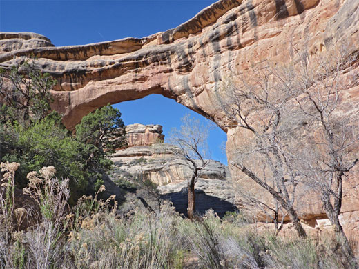 The closest two have NPS notices and hiker registers while those further away are unmarked, and (even) less visited. The route starts beneath the easternmost of the three bridges, Sipapu; a lesser trail winds eastwards through a fairly overgrown section of the drainage for one mile to a shapely formation known as Sphinx Rock, beyond which the canyon is more open and walking becomes easier, along terraces and sandbanks either side of the shallow creek. The most distant of the four ancient sites is reached after 3.6 miles, shortly before the national monument boundary, but other ruins are found further upstream along White Canyon, and in the brush-filled tributary of Burch Canyon.