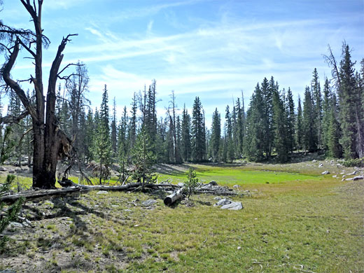 The Highline Trail descends through open forest, rocky underfoot, and passes a junction after half a mile with a connecting path to Mirror Lake. The main route is signed Rocky Sea Pass, which is 7.5 miles away. The next landmarks are a sign marking the boundary of the High Uintas Wilderness, a small stream flowing from a meadow on the left, and a larger stream and meadow a little further. The ground starts to rise gently, but the surroundings remain the same - unremarkable pine forest, generally dry, so wildflowers are relatively few in number. The second junction is with a short spur to tree-lined Scudder Lake on the right, after which the path is a fairly level for a while, passing another meadow (on the left), where Mount Agassiz comes fully in to view for the first time, albeit briefly, rising above the trees on the far side. This is followed by a third junction, with a southwards path to Wilder, Wyman and Packard lakes, and then some boardwalk sections over more marshy ground. There is little change for another mile to a fourth junction, where the Highline Trail continues straight on, and the route to Naturalist Basin forks off to the left (north). This has some gentle ascents between level parts, through woodland that begins to thin, as the trees mingle with piles of whitish boulders, yet views of the mountains ahead remain quite limited.