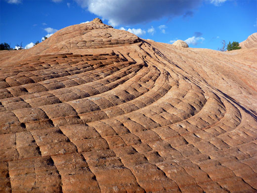 The exposed red rocks extend several miles east to west, spanning 500 feet or more of elevation, though the best area appears to be from the end of the trail a mile or so southeast. Lower down the ground is much less steep, more overgrown and has smaller erosive features. The main section is characterized by domes and cones, cliffs and ledges, and U-shaped gullies, with all surfaces generally quite smooth, though crossed by thin, parallel ridges and grooves due to the underlying cross-bedding. Some areas have neat hexagonal patterns. In a few places, the predominantly light-colored sandstone is interrupted by small, jagged intrusions of much darker rocks, resembling partly buried dinosaur bones. The wavy color patterns range in scale from thin parallel lines just a fraction of an inch apart to broad, curving bands several feet wide. Most colors seem somewhat faded however; there are few really bright patches. The cliffs face southeast so are best visited in the morning.