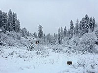 The trail junction near Stave Spring is at the edge of a meadow lined by some red rock outcrops and crossed by a small, seasonal stream. The path to Cable Mountain (and to the even more remote overlook at