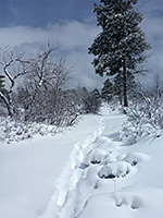 Deertrap Mountain) runs south up a low valley, passing a few more sandstone cliffs to the east, through sparse woodland of tall ponderosa pines, lacking much undergrowth. The route curves westwards, away from the valley floor, up a gentle hillside to a flat, less wooded area where the views open out. Another junction is soon reached, on a minor ridgetop; Deertrap Mountain is straight on while Cable Mountain is right. This path, quite narrow, rises slightly to a 6,940 foot summit, the highest point for some distance in all directions, then enters more forested land, coming close to the head of a sheer-walled ravine to the north, an inaccessible tributary of Echo Canyon.