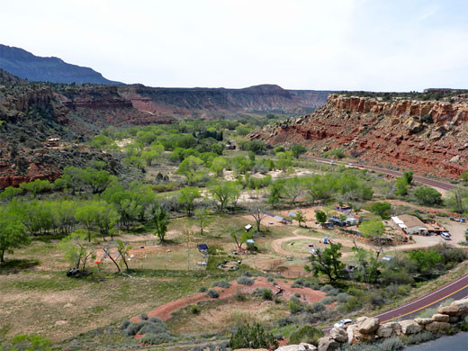 The Chinle Trail once began at the Zion National Park boundary, at the end of an unpaved track one mile from the highway, but the intermediate land is now part of the housing development, and is accessible to foot traffic only, though not along the road, instead on a winding path that first climbs the stony hillside above the parking lot, then bends back and crosses Anasazi Way, rounding the rim of a drainage close to several houses, whilst giving fine views of the wooded Virgin River valley, 150 feet below. The path leads up the drainage once it becomes shallow, crosses the road a second time and continues along the streamway briefly before rising to the sandy, treeless land to the west, and following the old track to a fence and gate that mark the Zion National Park boundary, beside a corral - the original start point of the trail.